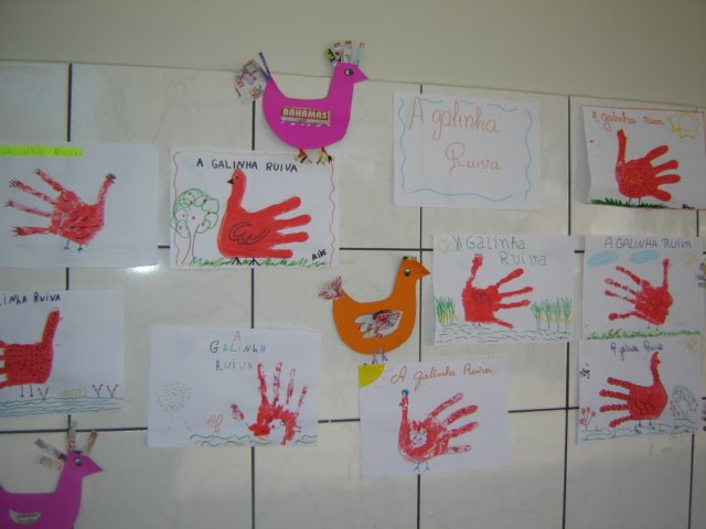 - Galinha feita a partir da mão carimbada completando o desenho com canetinha